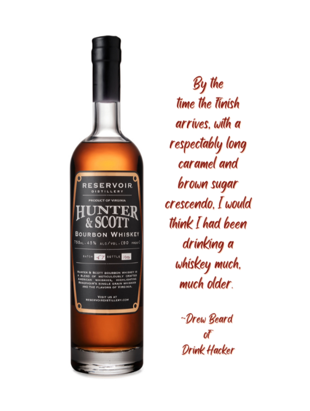 The Hunter & Scott Bourbon is for the cocktail mixer, a neat pour at the bar, or even the everyday sipper. Hunter & Scott bourbon whiskey is a blend of meticulously crafted American whiskies, highlighting Reservoir's single grain whiskies and the flavors of Virginia.
